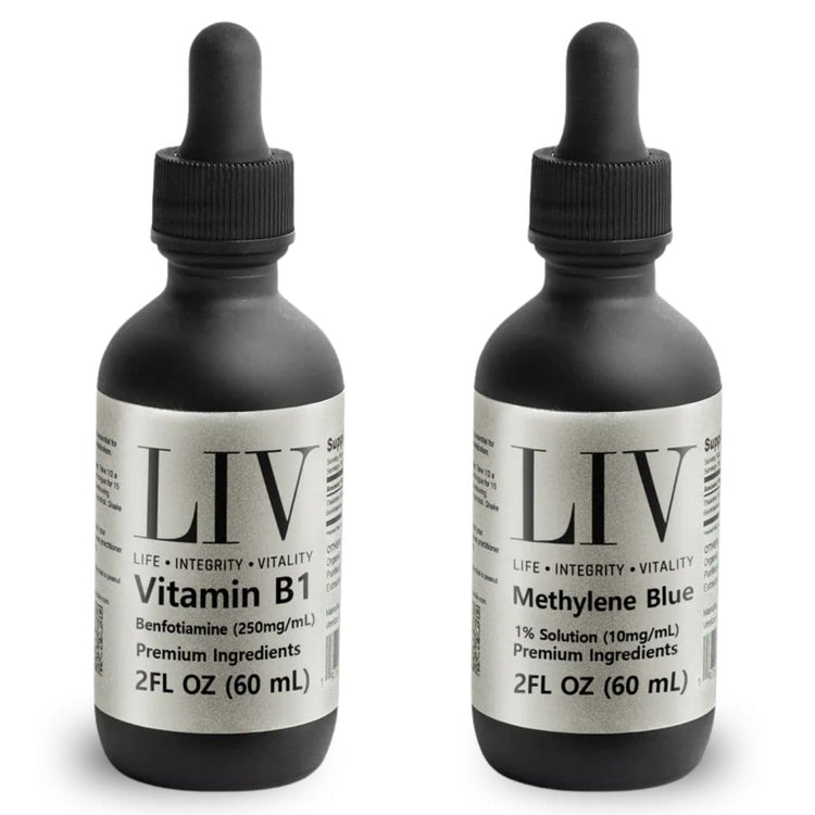 Includes: Methylene Blue Capsules (MB+™), Vitamin B12 Tri-Blend Liquid Energy Booster (5000mcg, 60 servings), Vitamin B1 Thiamine Liquid Metabolic Booster (Benfotiamine 250mg, 60 servings) Shop Now