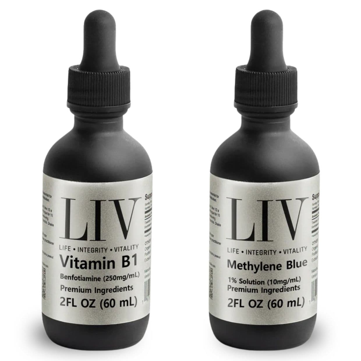 LIV Methylene Blue is a 1% concentration (strength) liquid solution of pharmaceutical-grade Methylene Blue. Each drop contains 0.5 mg of the active ingredient. It comes in a 60ml glass dropper bottle.